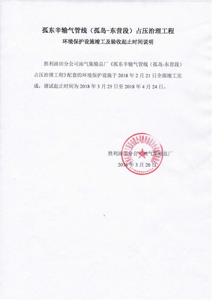 孤東辛輸氣管線(孤島-東營(yíng)段)占?jí)褐卫砉こ汰h(huán)境保護(hù)設(shè)施竣工及驗(yàn)收起止時(shí)間說明