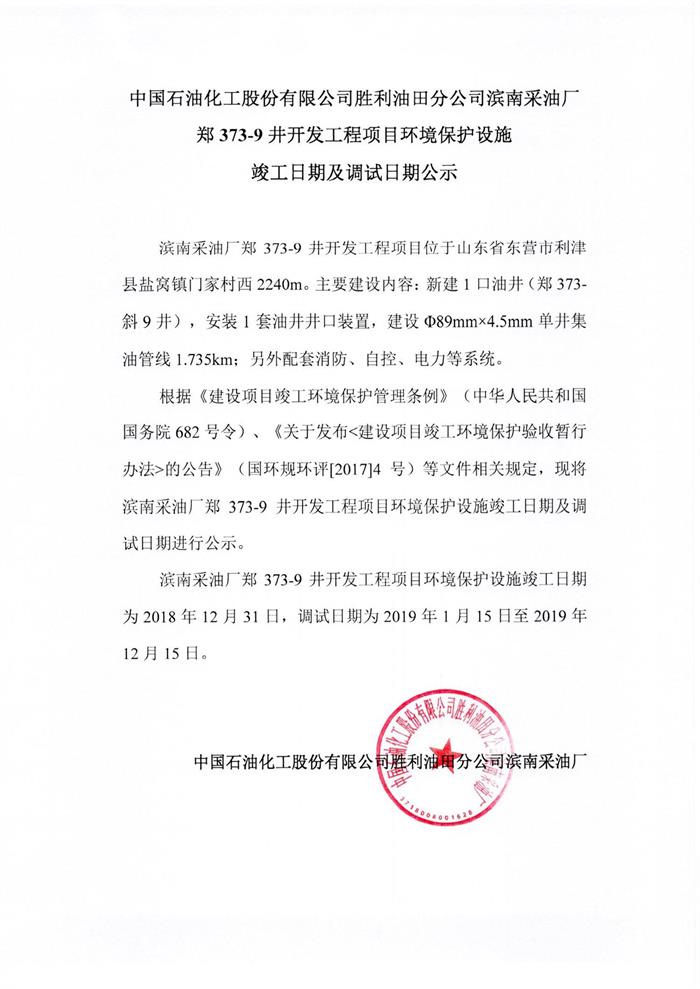 中國(guó)石油化工股份有限公司勝利油田分公司濱南采油廠(chǎng)鄭373-9井開(kāi)發(fā)工程項(xiàng)目環(huán)境保護(hù)設(shè)施竣工日期及調(diào)試日期公示