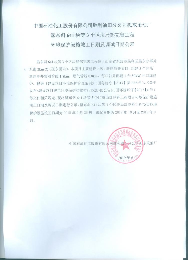 中國石油化工股份有限公司勝利油田分公司孤東采油廠墾東斜641塊等3個區(qū)塊局部完善工程環(huán)境保護設施竣工日期及調(diào)試日期公示