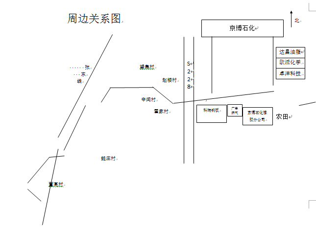 廠區(qū)西側(cè)為博小鐵路線,西側(cè)為盛和熱電有限公司和阿克蘇諾貝爾(博興)有限公司,再向西為勝利三路,自廠區(qū)西側(cè)出入口設(shè)一條道路與經(jīng)濟(jì)開(kāi)發(fā)區(qū)化工路相通,化工路向南通向205國(guó)道,兩路交叉口西南方向?yàn)椴┡d縣汽車站和協(xié)和醫(yī)院;廠區(qū)北側(cè)自西向東為凱和化工有限公司、董初村、董孫村,東側(cè)為空地,向東為淄東鐵路線,空地東北方向?yàn)槎瓕O村部分民居、再向東為博興五中,空地東南方向?yàn)槲魃项洞?;廠區(qū)向南依次為淄東鐵路線、引黃濟(jì)青干渠、205國(guó)道、東谷王村。 |