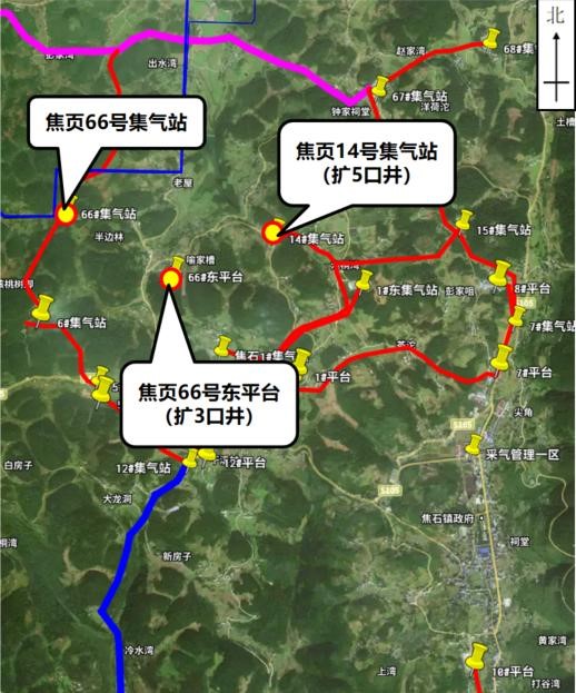 焦頁(yè)14號(hào)平臺(tái)新建井口距離東側(cè)最近的散居民房約258m,與東側(cè)架空電力線路約115m,與南側(cè)架空電力線路約81m,與西南側(cè)公路約55m。焦頁(yè)66號(hào)東平臺(tái)新建井口距離東北側(cè)最近的散居民房約99m,與西北側(cè)散居民房約114m,與北側(cè)公路約96m,與南側(cè)架空電力線路約80m。 |